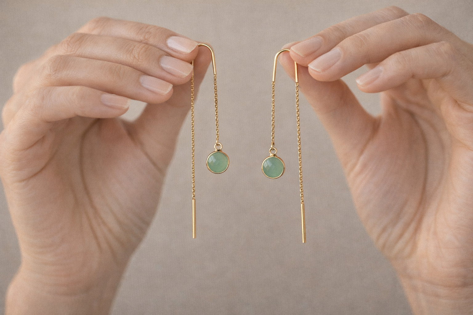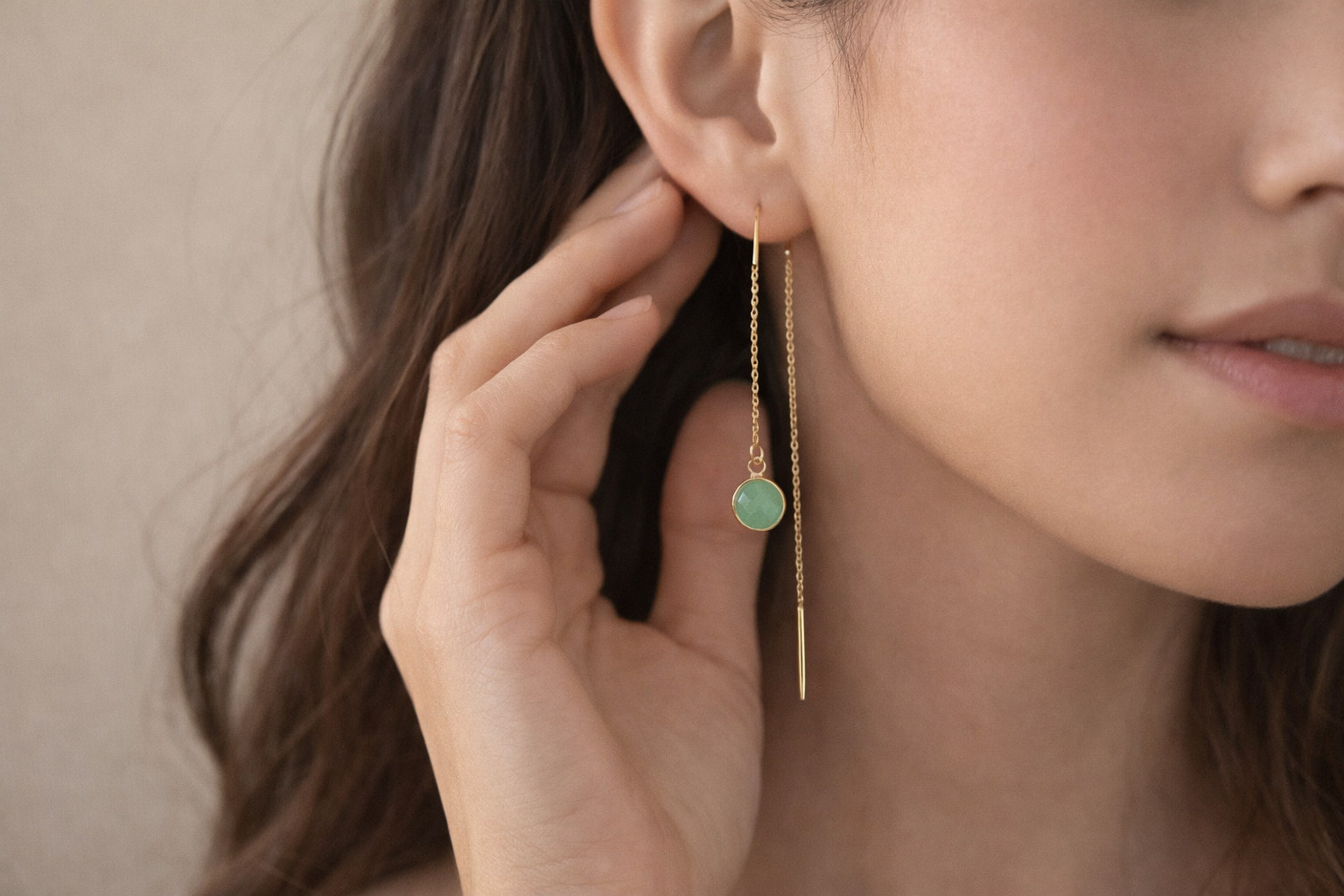 עגילים ארוכים עם נוכחות אלגנטית וקו נקי, עגיל תלוי המשתלשל בעדינות מהאוזן.