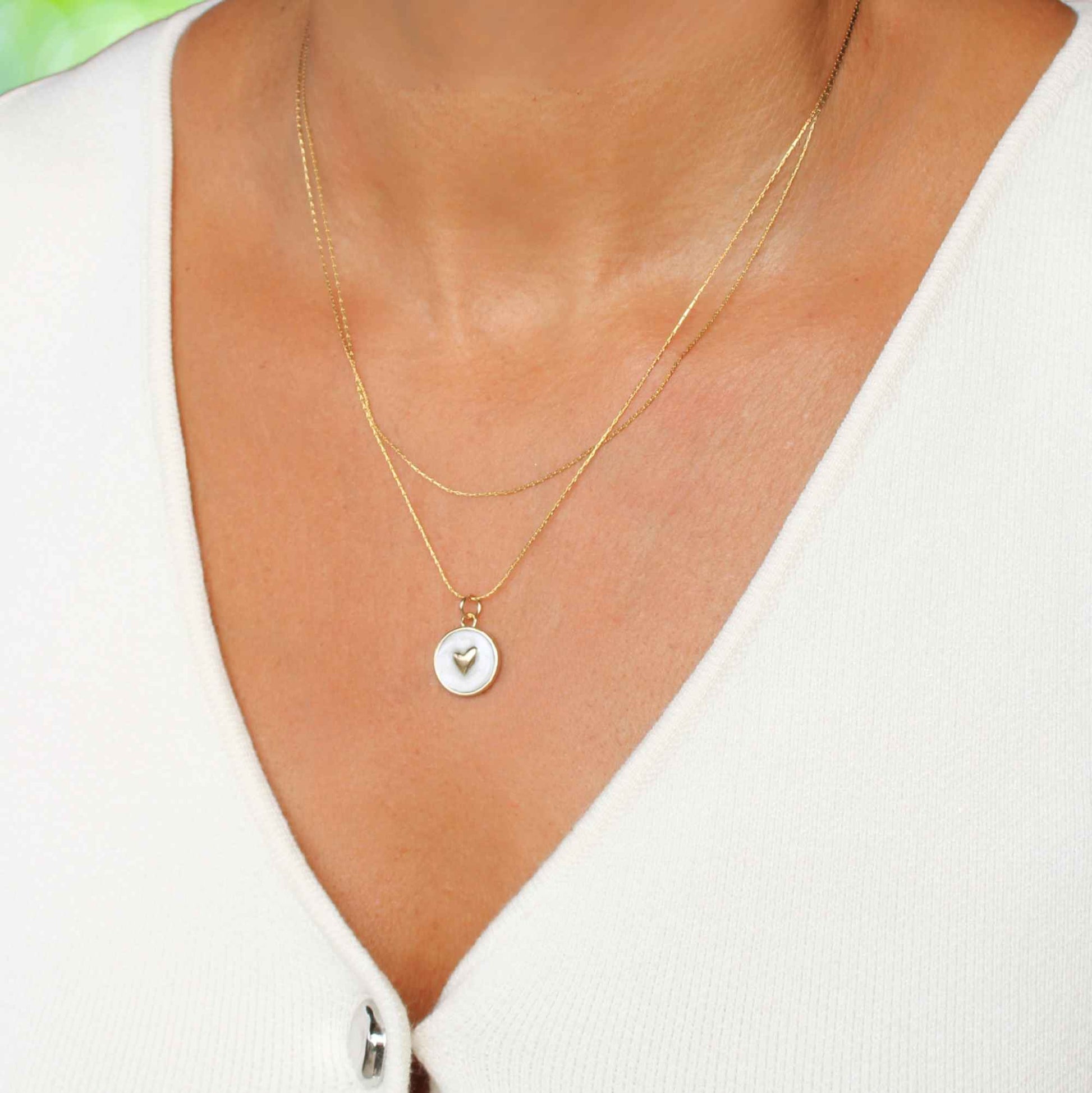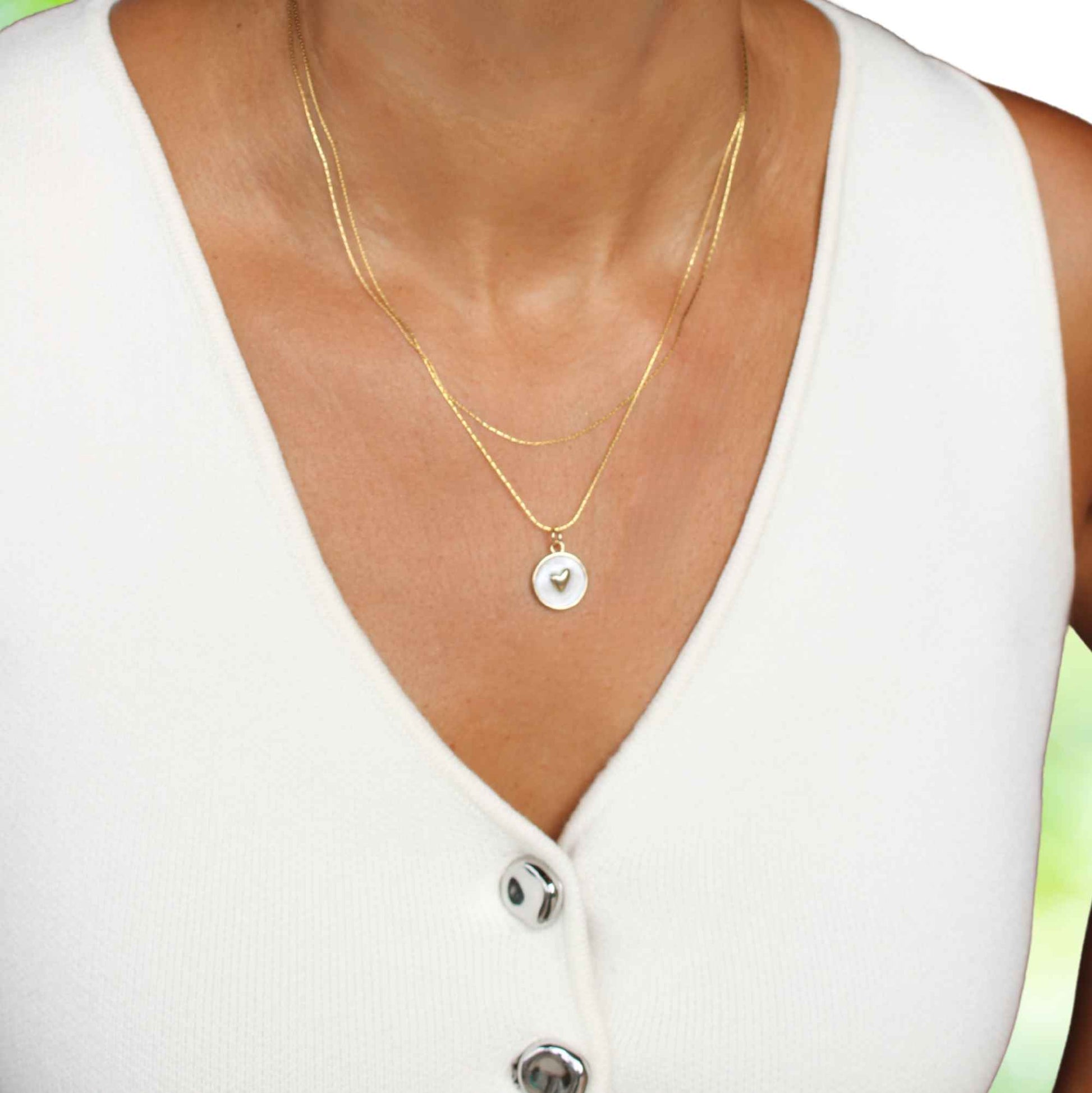 שרשרת שכבות אלגנטית עם תליון עגול בגוון פנינה משובץ לב זהב בולט עדין יפהפה בעיצוב נקי .