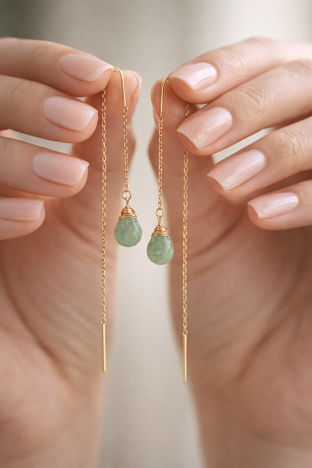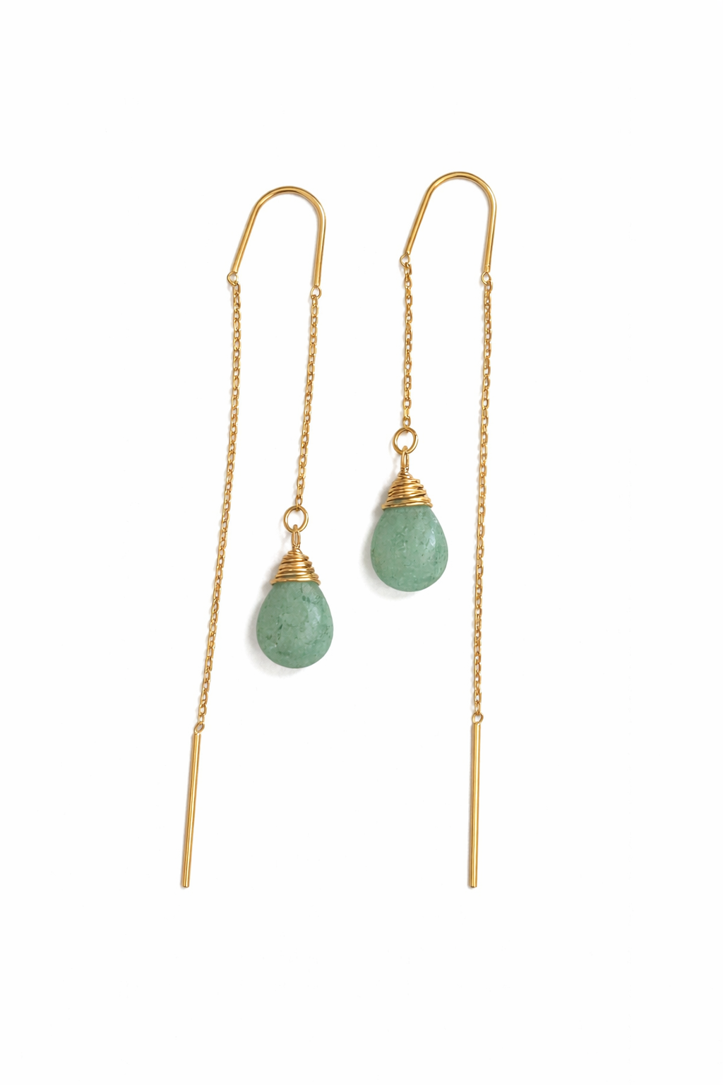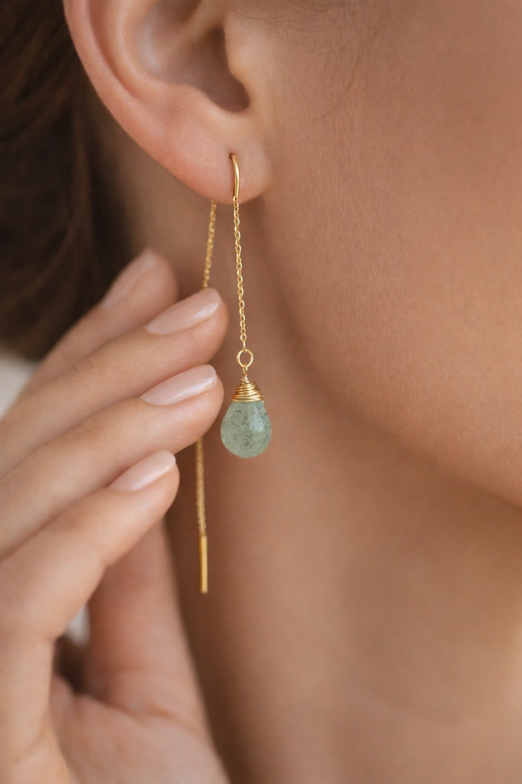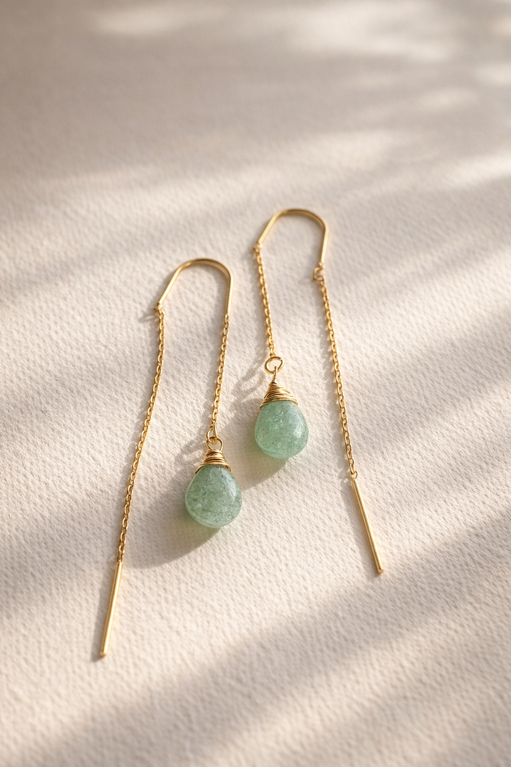 עגיל שרשרת אבן סטוברי קוורץ ירוק ,בשילוב ליפוף זהב למראה זוהר ונקי, עגיל עם נוכחות עדינה שמתאימה לאירועים למתנה או ליום יום